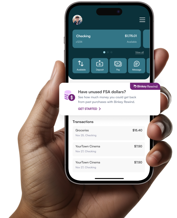 Binkey Rewind is a low-code, embedded widget that enables fintechs and financial institutions to offer a simple way for customers to get their money back for past FSA-eligible purchases (where a form of payment other than an FSA was used to pay).
